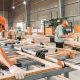 Horizontal color image of large group of automated injection moulding machines for plastic parts production.